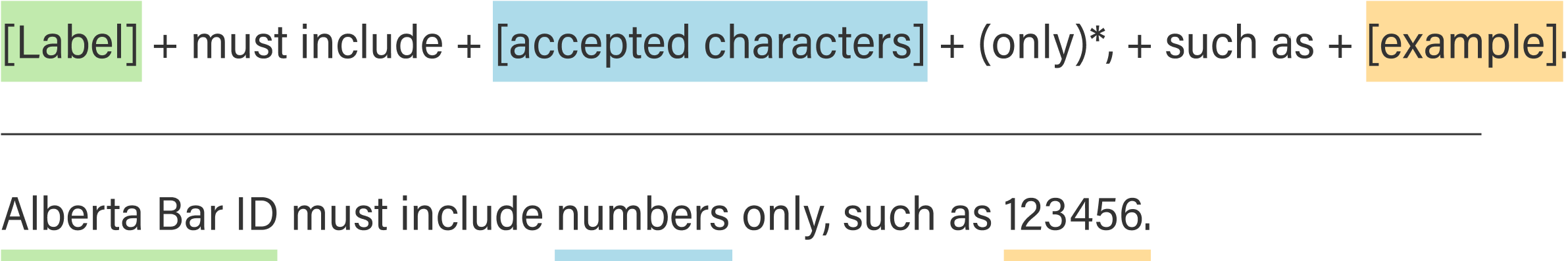Display valid characters when possible. This example also conveys the accepted letters case to the users.