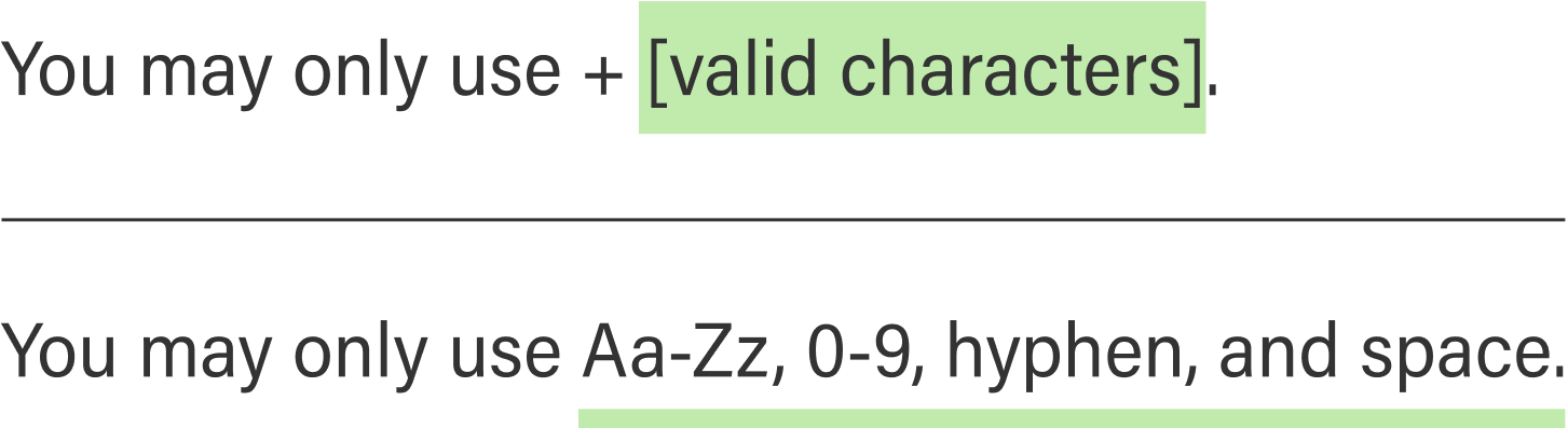 This error appears when user inputs invalid characters. To keep messages clear and concise, provide a guided solution.